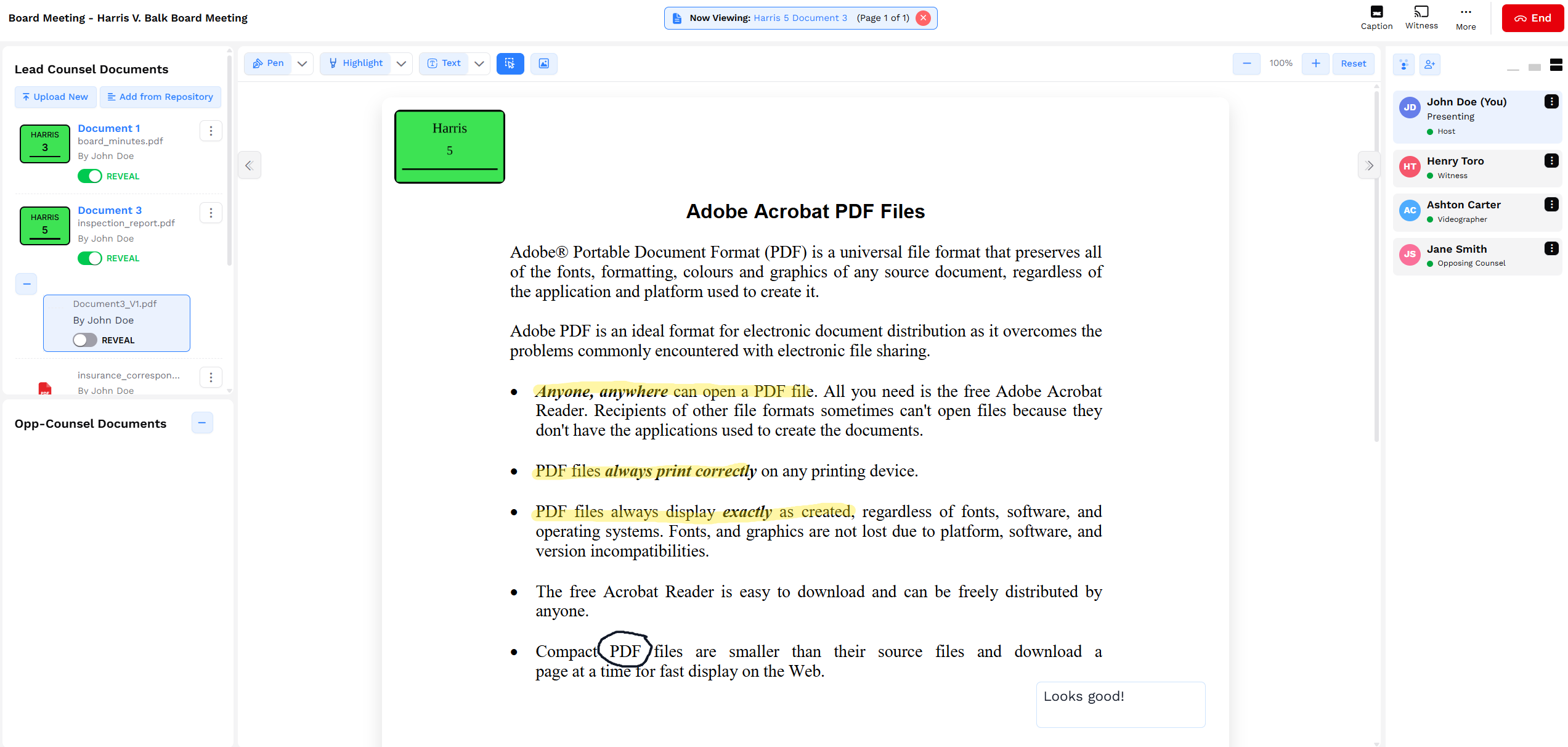 Present exhibits, collaborate with your team, and manage the deposition in real time.